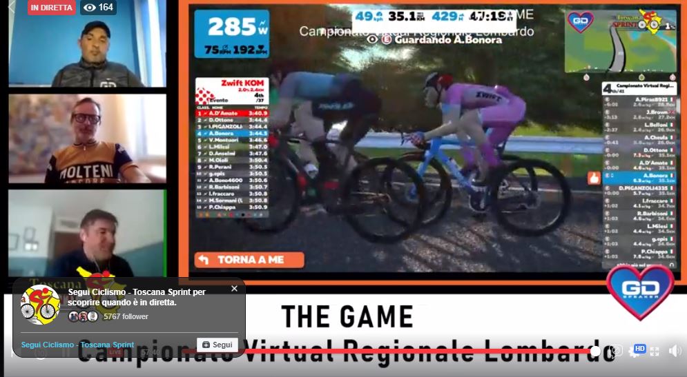 Per la cronaca, il primo campione virtuale lombardo è Andrea D’Amato (pavese del Team Giorgi), autore di una “fuga” a quattro con Davide Ottone (Giovani Giussanesi), Alessio Bonora (Massì Supermercati) e Davide Piganzoli (Ciclistica Trevigliese) e primo al traguardo virtuale dopo 53 minuti e 57 secondi alla media di 44,450 chilometri orari.
