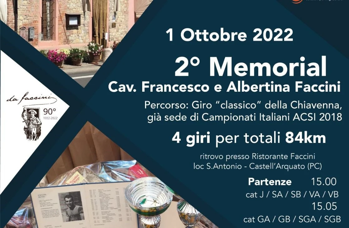 È di nuovo tempo del grande ciclismo a Castell’Arquato. Dopo la fortunata edizione del settembre 2019, terminata con la vittoria del Team Highroad proveniente da Peschiera del Garda, il Pedale Arquatese e il Ristorante “Da Faccini” tornano in pompa magna con il secondo appuntamento del “Memorial Cav. Francesco e Albertina Faccini”, sotto l’egida di ACSI Piacenza presieduta da Carlo Costa.