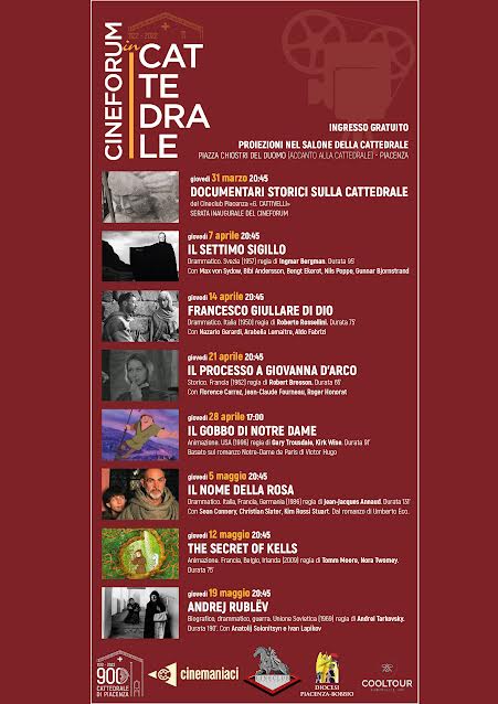 All’interno del ricco calendario di eventi per la celebrazione dei 900 anni della Cattedrale di Piacenza, giovedì 31 marzo prenderà avvio la rassegna “Cineforum in Cattedrale”, otto appuntamenti con il cinema d’autore e d’animazione. La rassegna, organizzata dalla Diocesi di Piacenza-Bobbio in collaborazione con la cooperativa Cooltour, l’associazione culturale Cinemaniaci e il Cineclub “G. Cattivelli” di Piacenza, vuole fornire spunti di riflessione e approfondimento, attraverso il linguaggio filmico, su temi legati al periodo di fondazione della Cattedrale, il Medioevo, e alla sua religiosità.