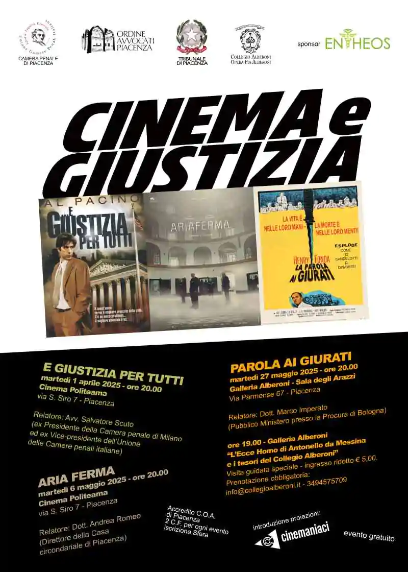Lo scopo del progetto è quello di condividere una serata al cinema e creare un’occasione di incontro e discussione su temi di grande richiamo. La prima serata si terrà il 1° aprile 2025 al Cinema Politeama (Piacenza, via San Siro 7) con la proiezione del film “E giustizia per tutti”. Introducono l’associazione Cinemaniaci di Piacenza e l’avv. Salvatore Scuto del Foro di Milano.