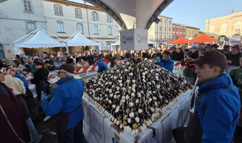 Dopo la Torta Rita da cinquemila pezzi distribuiti sabato, ad abbinarsi alle decine di metri di un salame di cioccolato da sette quintali, è stata la montagna di seimila palline di profiterole fatta di bignè sotto una cascata di morbido cioccolato.
