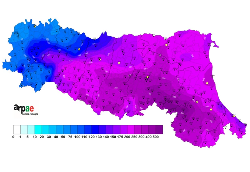 Il periodo di siccità si è bruscamente interrotto in seguito a un evento meteorologico estremo: tra il 1° e il 17 maggio due impulsi pluviometrici di due giorni a distanza ravvicinata hanno scaricato sulla Romagna e sulle aree centrali della regione un quantitativo di precipitazioni tra un quarto e metà del valore atteso per l’intero anno (secondo il clima 1991-2020); i totali di precipitazioni cumulate su 17 giorni hanno raggiunto valori fino a 609,8 mm a Trebbio (Modigliana, bacino del Lamone) e 563,4 mm a Le Taverne.