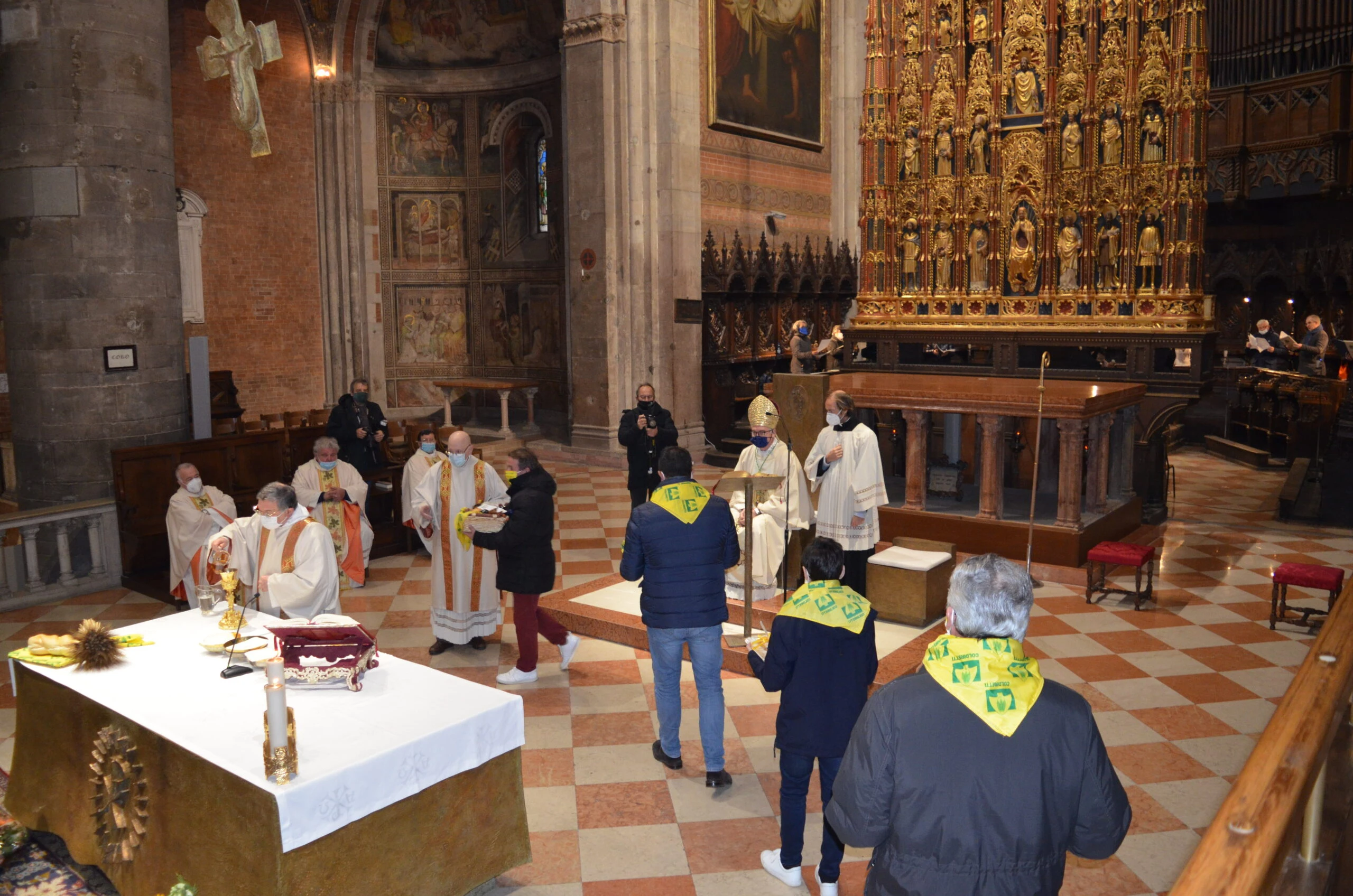 «Ribadiamolo a gran voce: noi ci siamo, siamo al servizio di tutta la collettività e vogliamo guardare avanti». Tutto l’evento si è svolto con la massima attenzione ai protocolli vigenti per il contenimento dell’emergenza sanitaria. Dopo la benedizione dei mezzi agricoli, disposti all’interno dei Chiostri del Duomo, è avvenuta la celebrazione della Santa Messa da parte del vescovo, Monsignor Adriano Cevolotto, e del consigliere ecclesiastico don Giuseppe Sbuttoni.