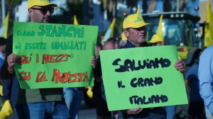 Ventimila agricoltori della Coldiretti sono scesi in piazza da Nord a Sud per dire basta ai trafficanti di grano che schiacciano il prodotto nazionale sotto i costi di produzione, costringendo le imprese agricole a lavorare in perdita e spingendo sempre più sulle importazioni estere. Un grido partito da Bari, cuore del “Granaio d’Italia”, e da Palermo, con manifestazioni simultanee anche a Cagliari, Rovigo e Firenze, tra cartelli, cori e sacchi vuoti con il tricolore per denunciare un sistema che distrugge il reddito agricolo. A rischio ci sono quasi 140mila imprese agricole, soprattutto nel Mezzogiorno.