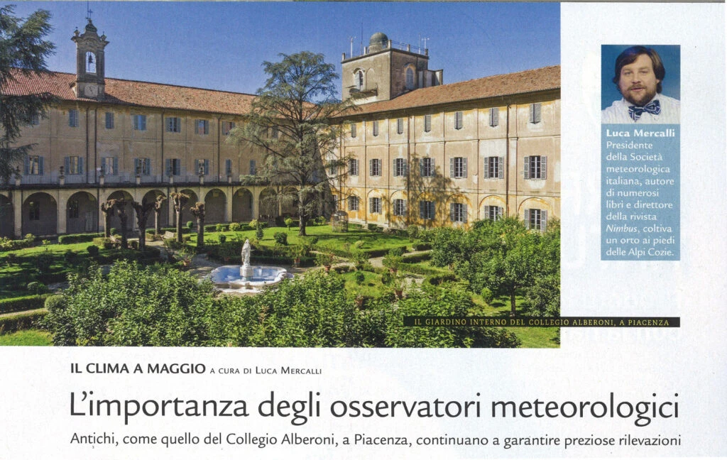 Mercalli cita infatti gli osservatori meteorologici immersi nei più noti parchi del mondo come Central Park a New York o il parco di Montsouris a Parigi, ma focalizza il suo articolo proprio sul giardino interno e sul parco del Collegio Alberoni il cui osservatorio meteorologico è stato nominato di recente Centennial Observing Station dall’Organizzazione Meteorologica Mondiale (WMO).
