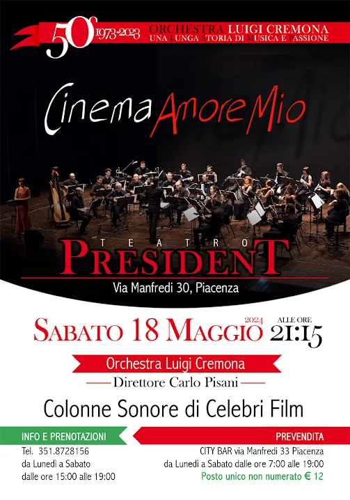 Sabato 18 maggio alle ore 21,15 al Teatro President di Piacenza l’Orchestra Luigi Cremona, diretta dal maestro Carlo Pisani presenta: “Le indimenticabili colonne sonore di celebri film in uno spettacolo unico e suggestivo”.