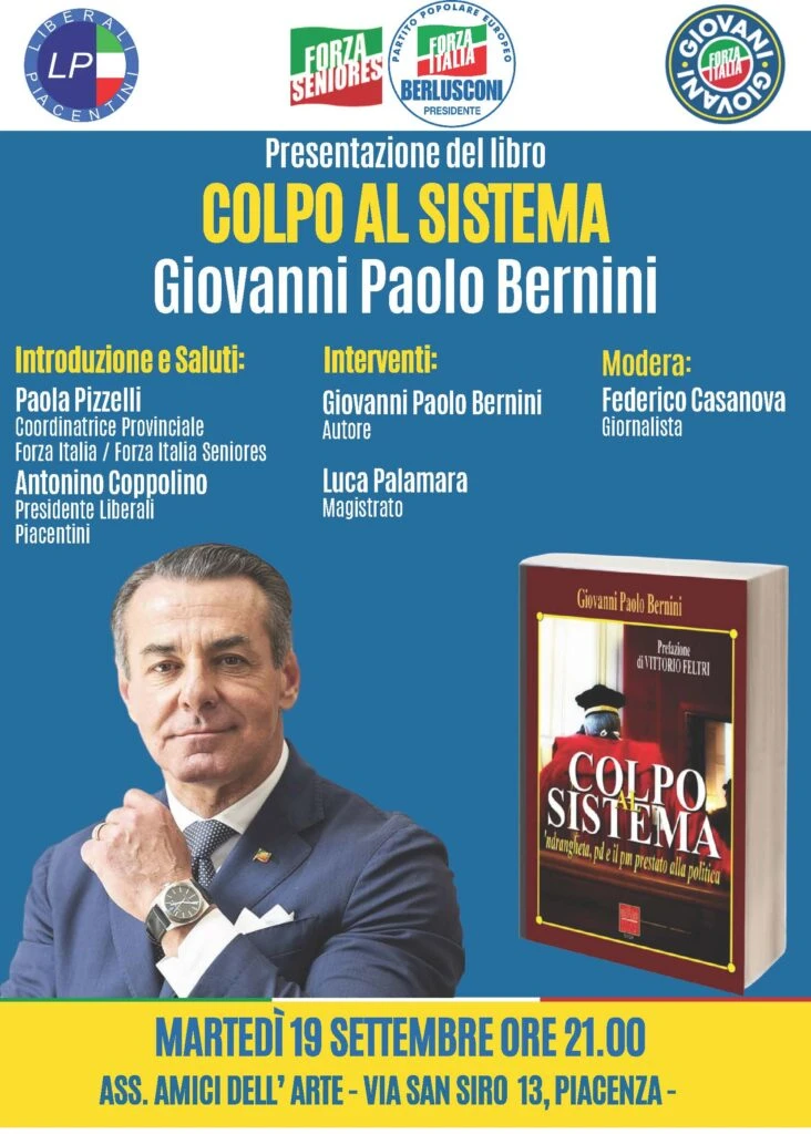 C’è questo e molto altro nel libro COLPO AL SISTEMA, scritto nel 2023 da Giovanni Paolo Bernini, ex presidente del Consiglio comunale di Parma, per anni punto di riferimento del centrodestra in Emilia Romagna. Il volume – pubblicato da Titani Editori – verrà presentato a Piacenza martedì 19 settembre, alle ore 21, presso l’Associazione Amici dell’Arte, in via San Siro 13. Durante l’evento, organizzato dalla sezione locale di Forza Italia e da Liberali Piacentini, interverranno anche Paola Pizzelli (coordinatrice provinciale di Forza Italia), Antonino Coppolino (presidente di Liberali Piacentini) e il magistrato Luca Palamara.