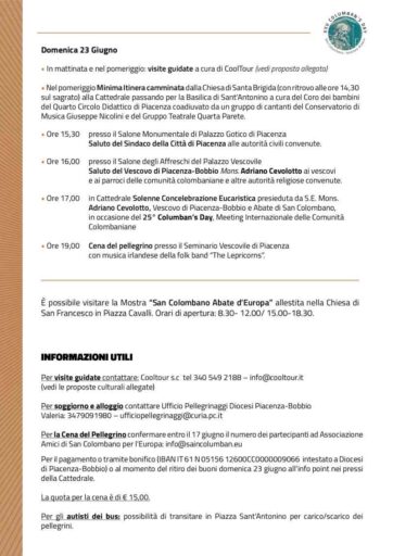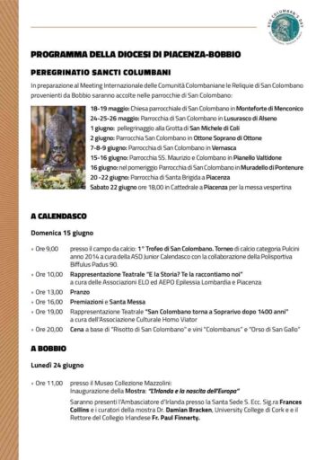 Alle giornate conclusive interverranno rappresentanti delle Comunità colombaniane di altri Stati europei, in particolare dall’Irlanda, dalla Francia, dalla Svizzera e dalla Germania.