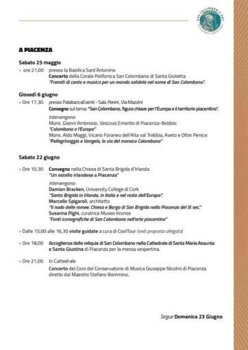 Columban’s Day per la prima volta a Piacenza il 22 e 23 giugno, giunto alla sua venticinquesima edizione. L’iniziativa, ricca di tanti appuntamenti in diversi luoghi della diocesi, ha preso le mosse alla fine degli anni Novanta del secolo scorso a San Colombano al Lambro ed è promossa dall’Associazione San Colombano per l’Europa.