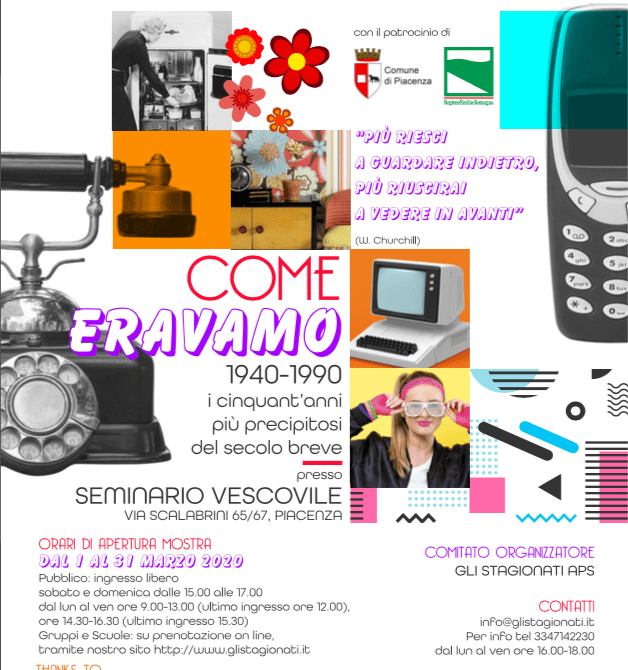 Per tutto il mese di marzo nei locali del Seminario vescovile di via Scalabrini a Piacenza resterà aperta la mostra dal titolo “Come eravamo : 1940-1990, il cinquantennio più… precipitoso del secolo breve”. Una mostra allestita dall’associazione “Gli Stagionati” e indirizzata non solo agli studenti di medie e superiori con prenotazione online, ma anche a tutta la cittadinanza con ingresso libero.