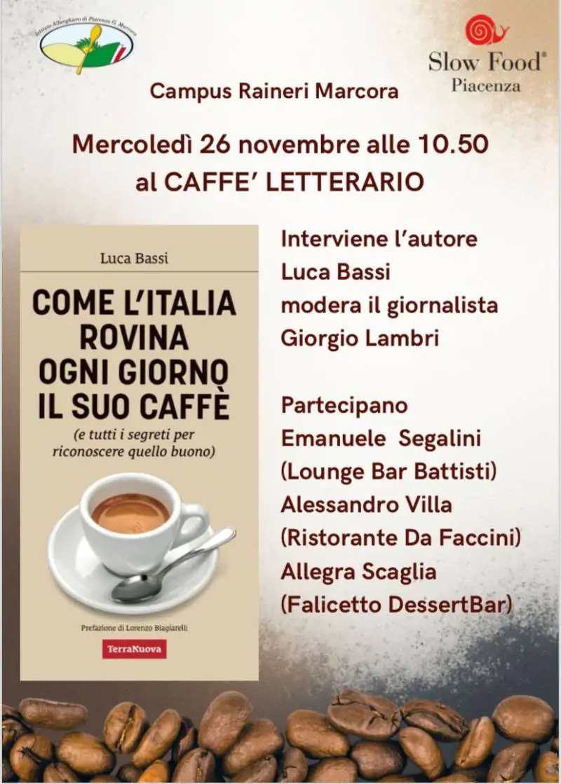 Presentazione del libro “Come l’Italia rovina ogni giorno il suo caffè” di Luca Bassi. L’appuntamento è in programma martedì 26 novembre ore 10.45 al Caffè Letterario – Istituto Raineri Marcora, Piacenza