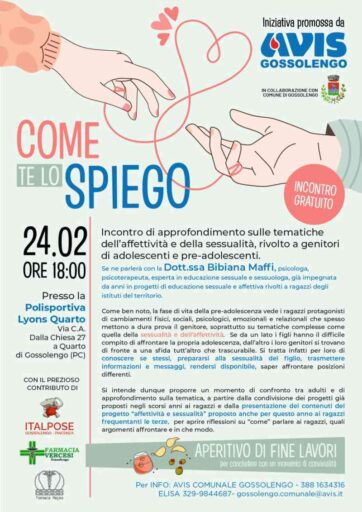 “Come te lo spiego”, a Gossolengo il 24 febbraio si parla di  affettività e della sessualità. L’incontro, in programma alle ore 18 alla Polisportiva Lyons Quarto intende affrontare le tematiche con  genitori di adolescenti e pre-adolescenti.