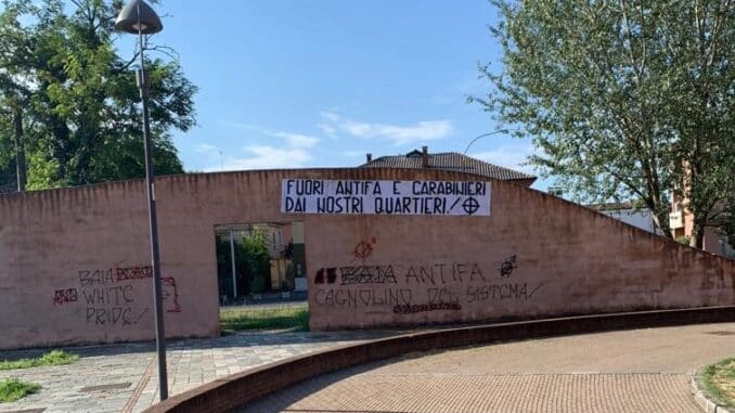 In particolare, è stato segnalato alle forze dell’ordine il posizionamento di uno striscione che recita “FUORI ANTIFA E CARABINIERI DAI NOSTRI QUARTIERI”.