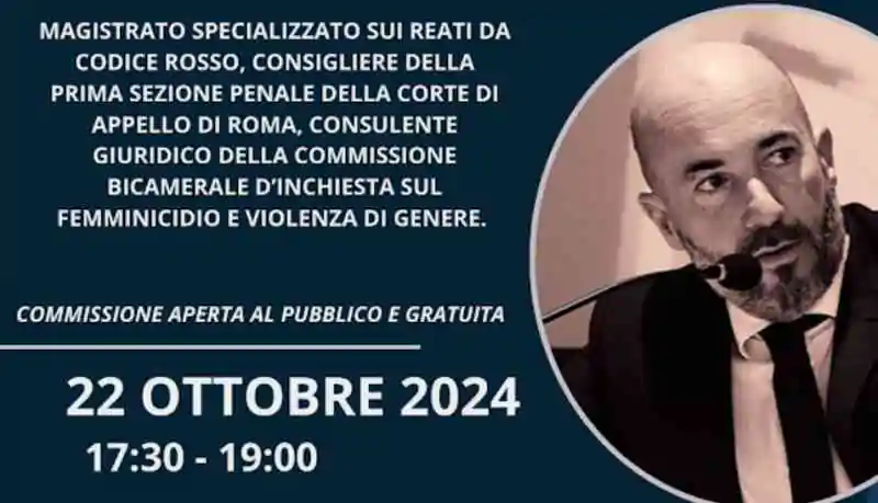 Martedì 22 ottobre alle ore 17.30, la Commissione delle Elette, presieduta dal consigliere comunale Gloria Zanardi, si riunirà presso la sala consigliare a Palazzo Mercanti per l’audizione del dott. Valerio De Gioia, magistrato specializzato sui reati da Codice Rosso, consigliere della prima sezione penale della Corte di Appello di Roma e consulente giuridico della commissione bicamerale d’inchiesta sul femminicidio e ogni violenza di genere.