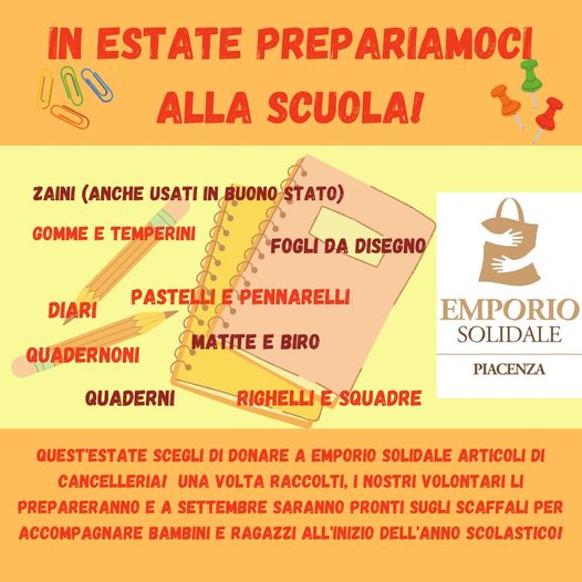 “Presso l’Emporio Solidale durante gli orari di apertura – sottolinea Lidia Frazzei – è possibile donare materiale scolastico. Penne, matite pastelli, quaderni ma anche zaini e astucci usati purchè in buono stato. A settembre saremo così in grado di poter organizzare lo scaffale dedicato agli studenti delle famiglie che necessitano di aiuto”.