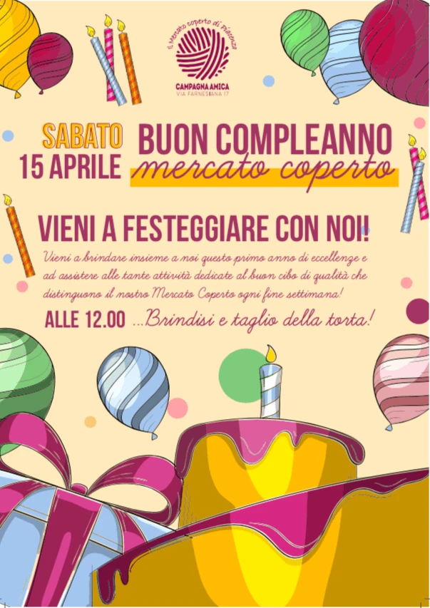 Sabato 15 aprile alle ore 12 è previsto il primo compleanno del Mercato Coperto di Campagna Amica in via Farnesiana, 17 a Piacenza.
