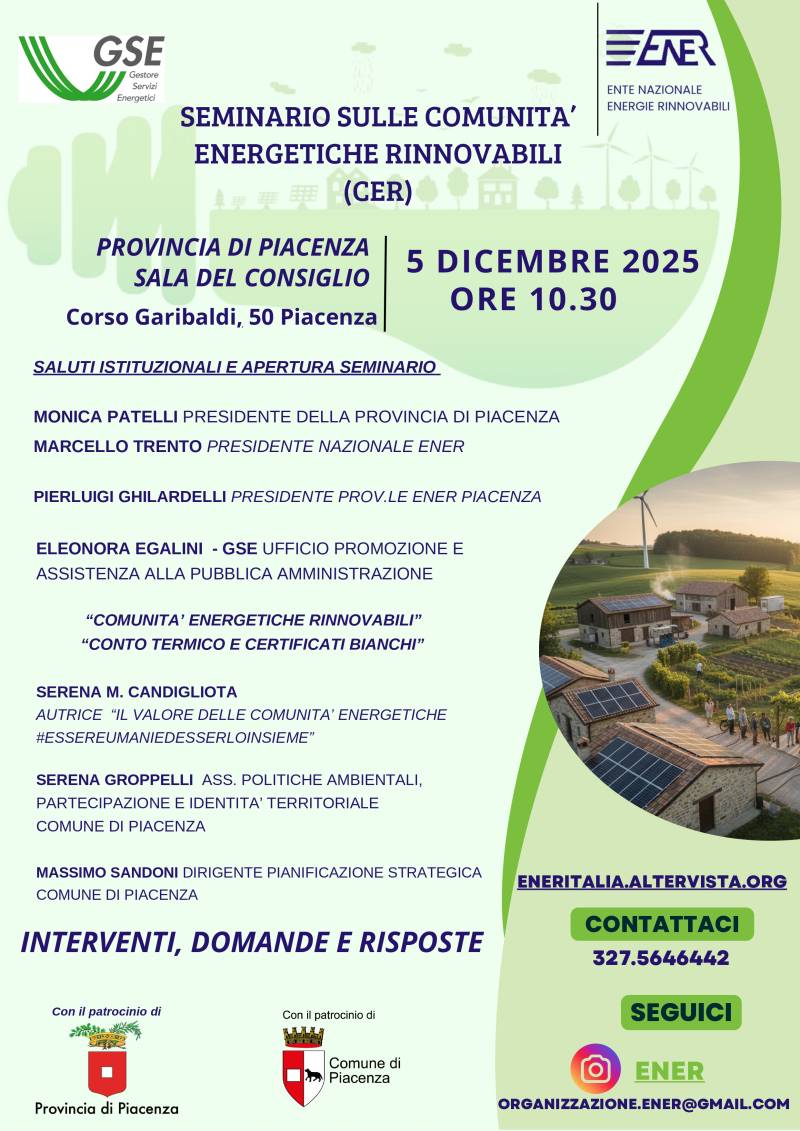 Venerdì 5 dicembre, alle ore 10.30, nella Sala del Consiglio della Provincia di Piacenza, Corso Garibaldi n. 50, sarà ospitato l’evento organizzato da ENER e GSE, con il patrocinio del Comune e della Provincia di Piacenza, dal tema “Comunità Energetiche Rinnovabili” (CER).