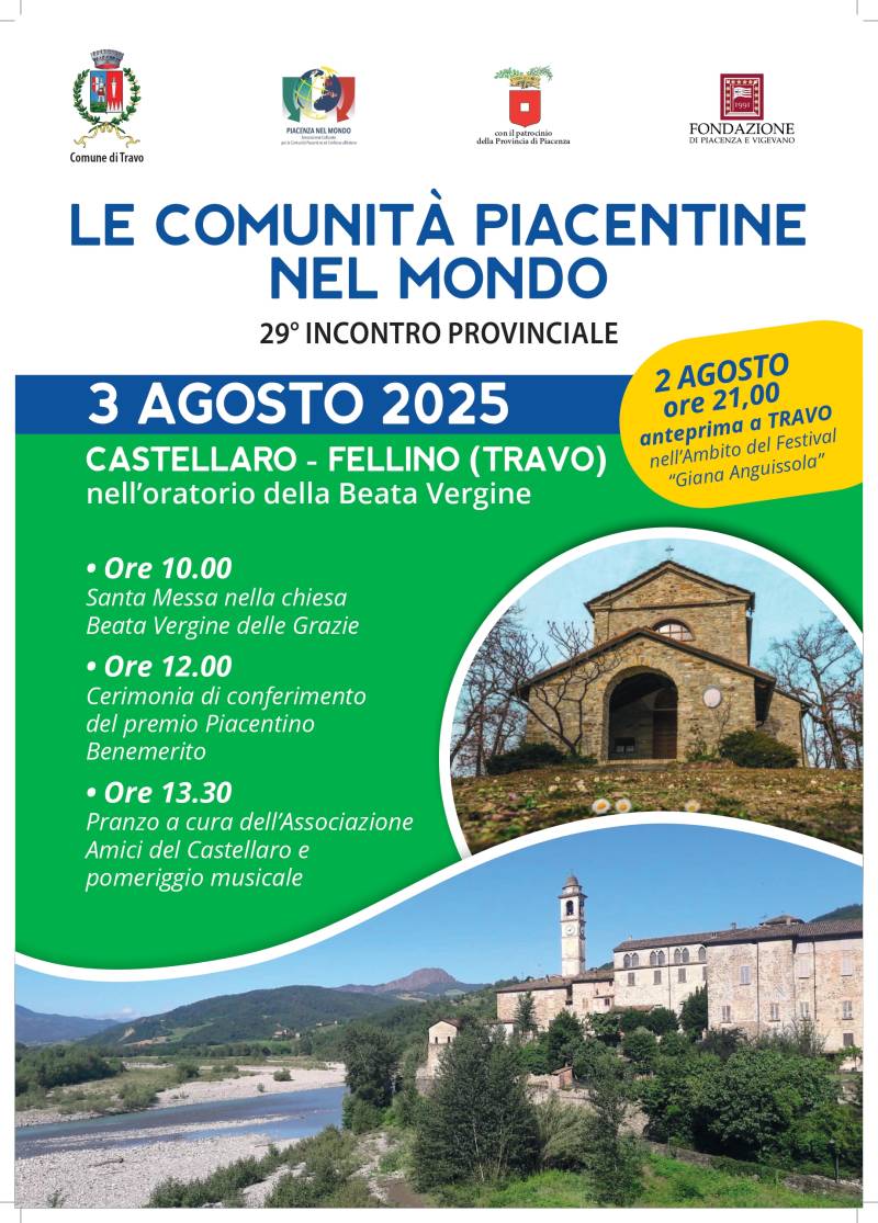 Il 29° incontro provinciale con le Comunità Piacentine nel Mondo si terrà domenica 3 agosto a Castellaro-Fellino (Travo). A precederlo sarà l’anteprima di sabato 2 agosto a Travo nell’ambito del festival “Giana Anguissola”.