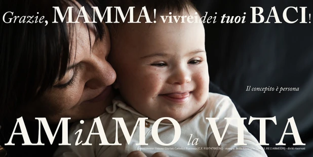 Un bimbo down in braccio alla mamma che, con il papà, lo ha accettato e fatto venire alla luce. Due slogan scandiscono la forza dell’immagine: ‘Grazie mamma, vivrei dei tuoi baci’, è la prima cosa che ha detto la madre parlando della esperienza di vita del piccolo.