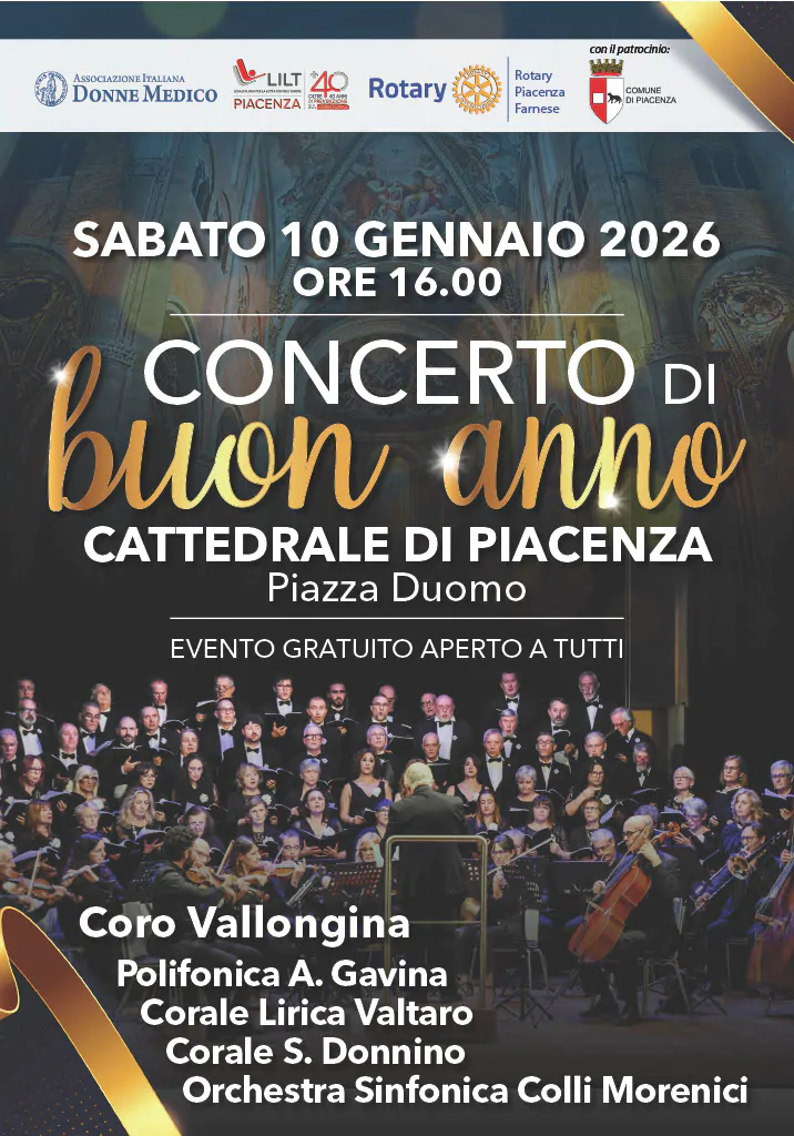 Sabato 10 gennaio è in programma alla Cattedrale di Piacenza in Piazza Duomo, il “Concerto di Buon Anno”. E’ un evento organizzato dalla Lega Italiana Lotta ai Tumori in unione con il Rotary Club Piacenza Farnese e l’Associazione Italiana Donne Medico, con il patrocinio del Comune di Piacenza.