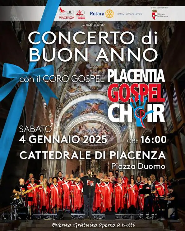 L’evento è stato presentato da Franco Pugliese presidente di Lilt Piacenza, l’assessore alla Cultura del Comune di Piacenza Christian Fiazza, il maestro Francesco Zarbano direttore del Placentia Gospel Choir e Fausto Merli presidente del Rotary Club Piacenza Farnese.
