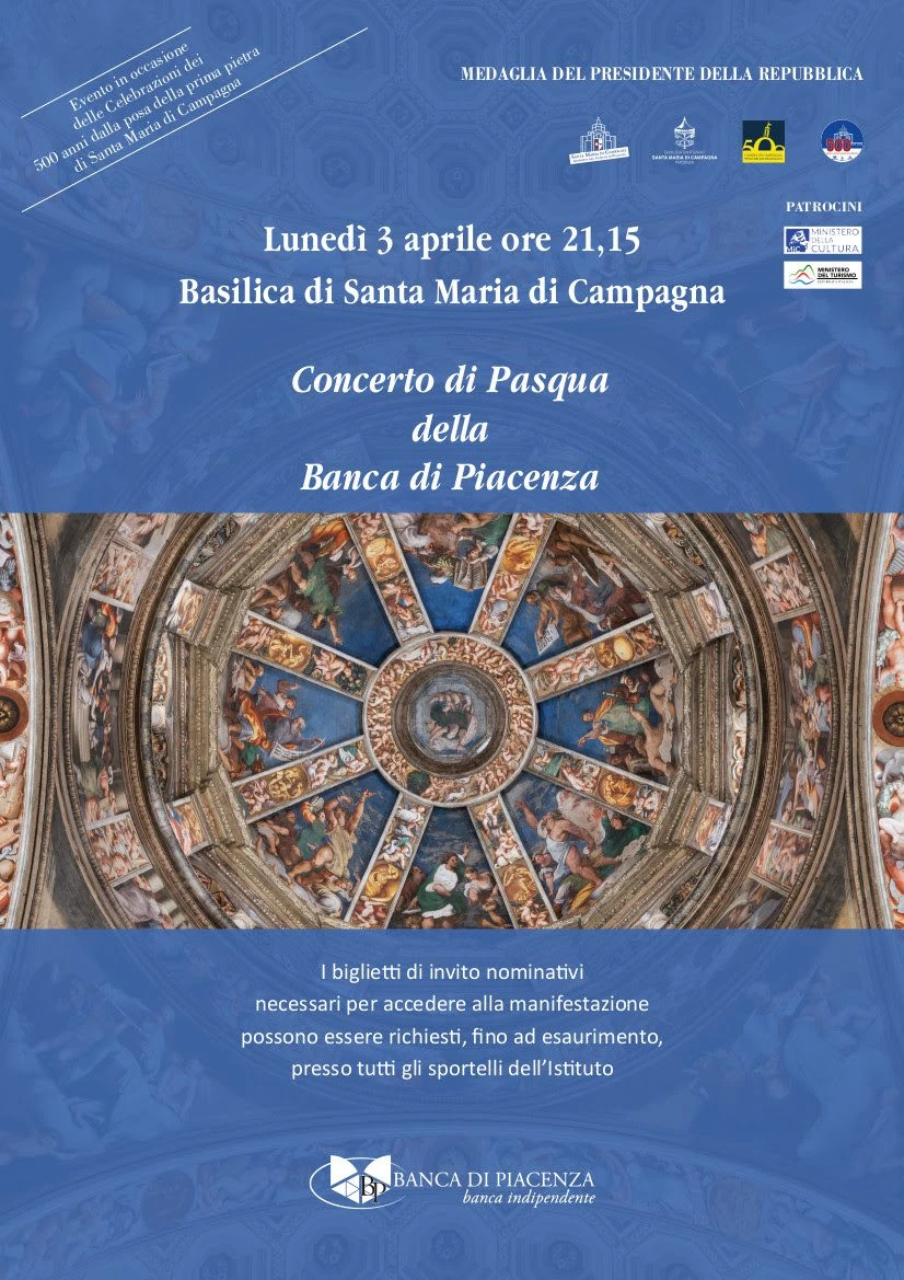 Prosegue la tradizione del Concerto di Pasqua della Banca di Piacenza, giunto alla 37ª edizione. L’appuntamento – che rientra nel programma delle celebrazioni dei 500 anni dalla posa della prima pietra di Santa Maria di Campagna – è per lunedì 3 aprile, alle 21.15, nella splendida cornice della Basilica mariana.