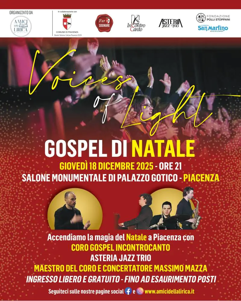 Giovedì 18 dicembre, alle 21, il Salone Monumentale di Palazzo Gotico si accende di emozione con VOICES OF LIGHT. Il grande Concerto Gospel di Natale promosso dagli Amici della Lirica per Sistema Cultura Piacenza 2025.