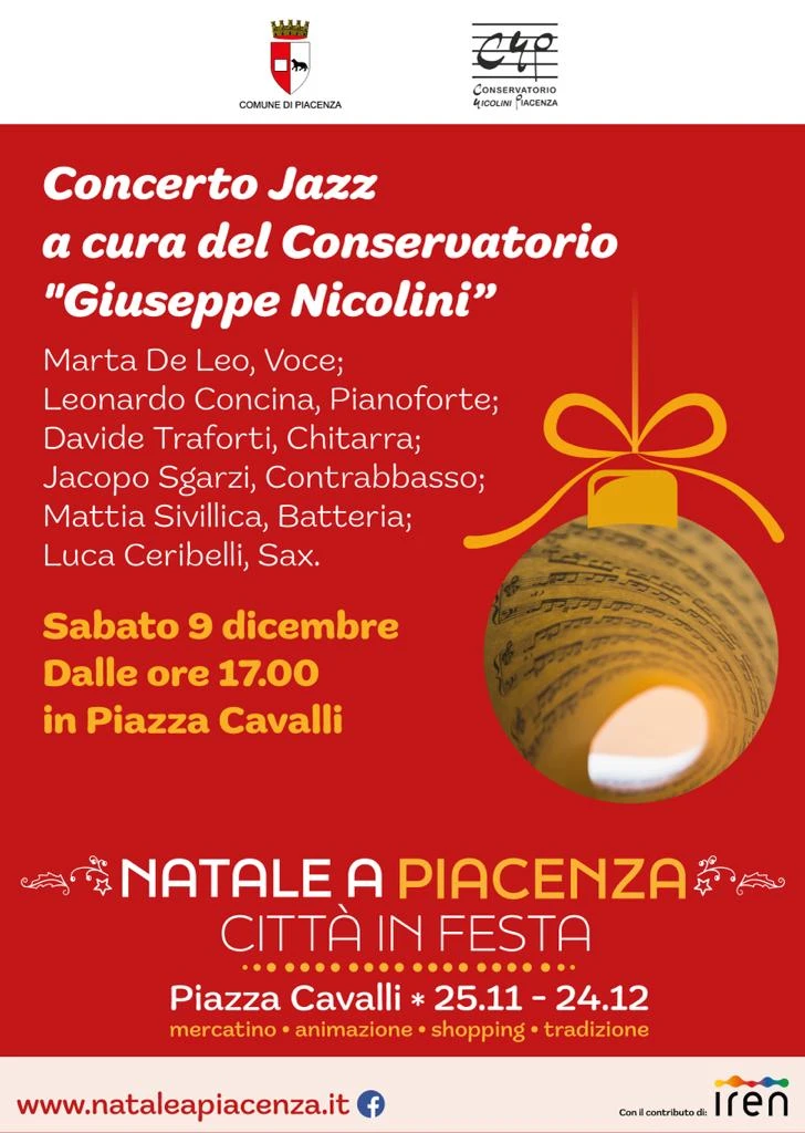 Tutto pronto per il concerto Jazz che il Conservatorio Nicolini proporrà sul palco di piazza Cavalli, nell’ambito delle iniziative che animano il Natale di Piacenza, sabato 9 dicembre alle 17. L’evento è realizzato anche in collaborazione con le associazioni che compongono la Cabina di Regia.