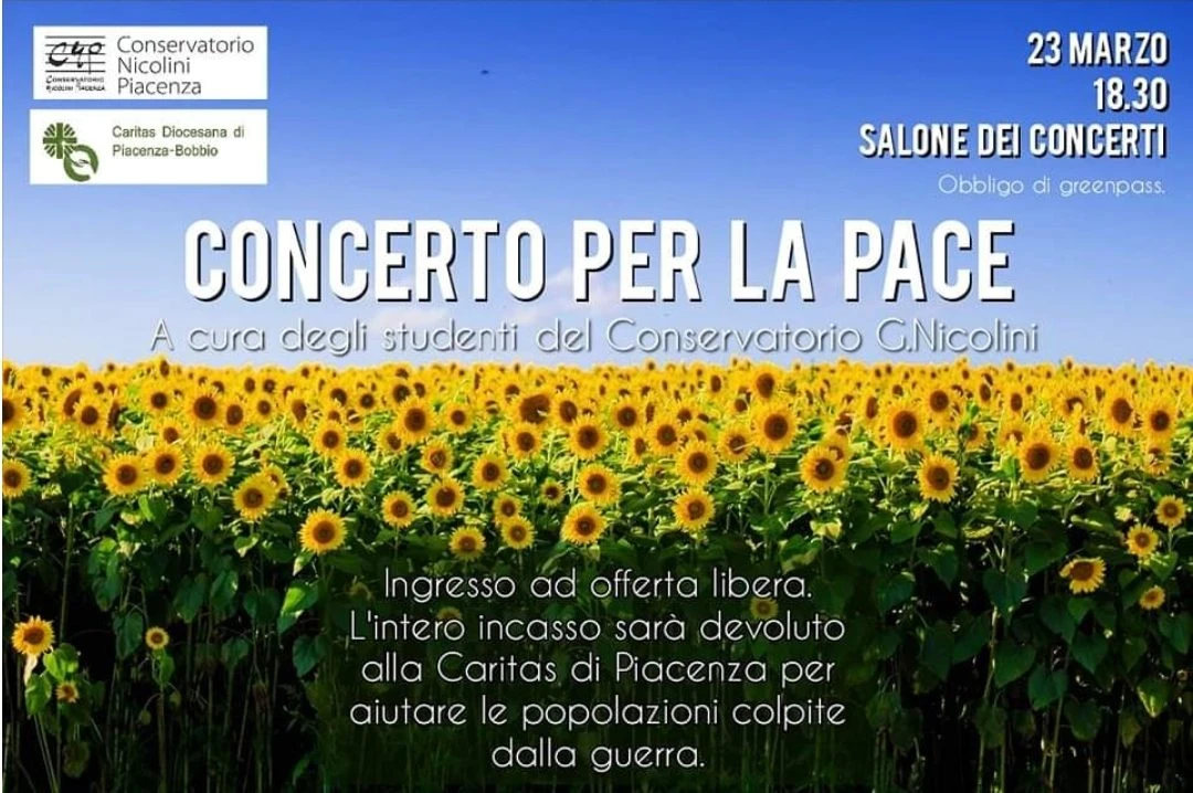 Il Conservatorio Nicolini e Caritas Diocesana uniscono le proprie forze per dire no alla guerra. Mercoledì 23 marzo alle ore 18.30 nel Salone dei Concerti del Conservatorio si terrà il ‘Concerto per la Pace’, a cura degli studenti della scuola di alta formazione musicale di via Santa Franca, per raccogliere fondi a favore delle popolazioni colpite dalla guerra. Saranno nove i brani eseguiti da una quindicina di allievi del Nicolini che provengono da diverse nazioni europee ed extraeuropee.