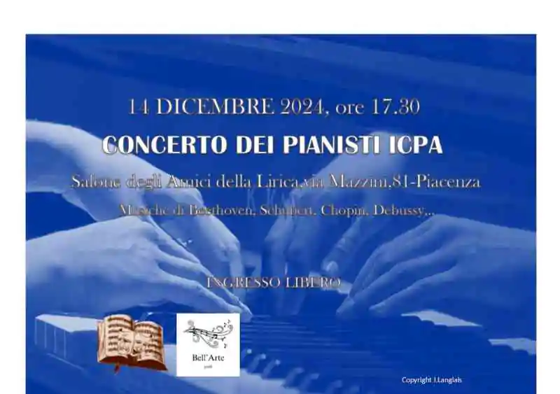 Gli Amici della Lirica di Piacenza presentano il Concerto Pianistico Finale ICPA in collaborazione con la Fondazione Bell’Arte(Belgio). L’evento è in programma sabato 14 Dicembre alle 17.30 sede degli Amici della Lirica,via Mazzini 81, Piacenza.