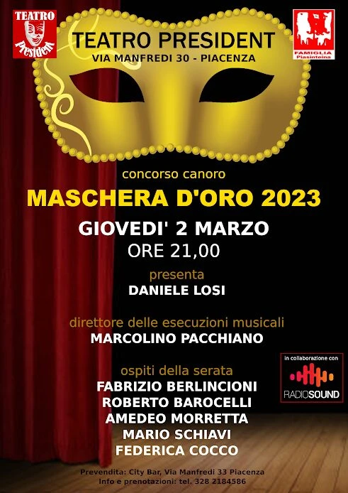 Appuntamento con la Maschera d’oro 2023 giovedì 2 Marzo alle ore 21 presso il Teatro President a Piacenza, prevendite presso il bar City di via Manfredi, botteghino del teatro aperto dal pomeriggio di giovedì.