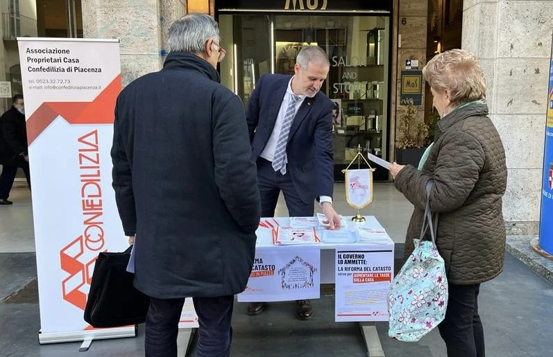 Questa mattina la Confedilizia di Piacenza, da una postazione collocata all’inizio di Via XX Settembre, ha distribuito ai cittadini materiale informativo per metterli a conoscenza dei rischi della revisione degli estimi catastali, prevista dall’art. 6 del disegno di legge delega per la riforma fiscale.