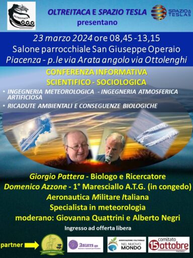 Conferenza informativa Scientifico – Sociologica organizzata dalle associazioni di promozione sociale, Oltre Itaca e Spazio Tesla, sostenute dalle realtà Piacentine del coordinamento, si svolge a Piacenza sabato 23 marzo 2024 dalle 9 alle 13.00 presso l’auditorium parrocchiale San Giuseppe Operaio – in via Arata angolo via Ottolenghi.