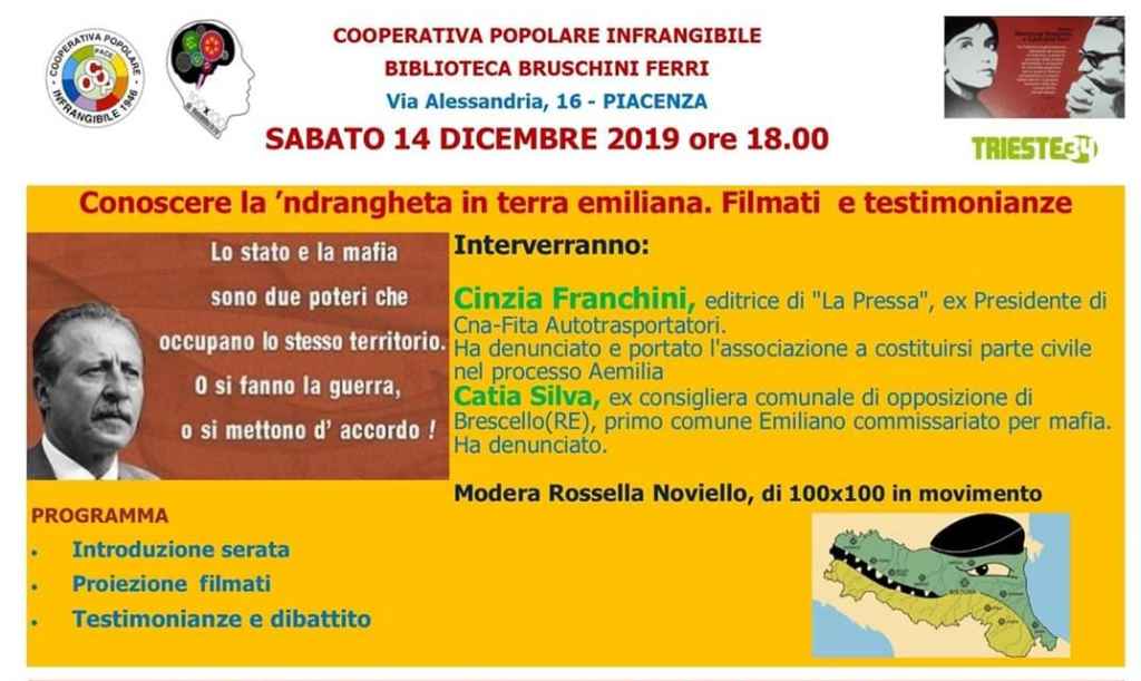 L’associazione 100x100inmovimento Aps organizza un incontro sul tema “conoscere la ‘ndrangheta in terra emiliana” per sabato 14 dicembre alle ore 18.00. Appuntamento presso la Biblioteca Bruschini Ferri della cooperativa popolare infrangibile di via Alessandria a Piacenza. Filmati e testimonianze per capire quanto e come le mafie, la’ ndrangheta in particolare, occupano i nostri territori.