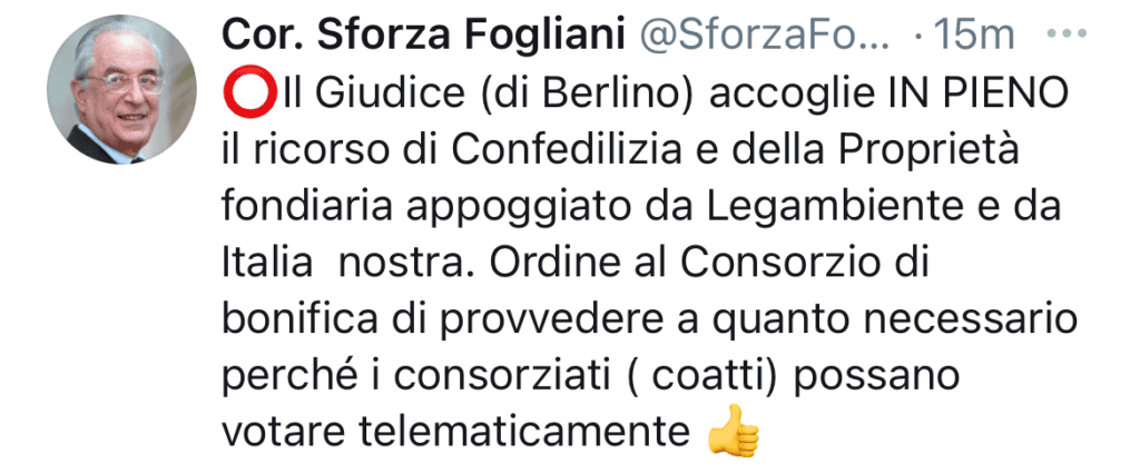 Il Giudice Tiberti ha emanato pochi minuti fa una ordinanza che sospende le elezioni del consorzio di bonifica in programma il 13 e 14 dicembre. Una decisione che Corrado Sforza Fogliani commenta su Twitter: “Il giudice di Berlino accoglie in pieno il ricorso di Confedilizia e della Proprietà Fondiaria appoggiato da Legambiente e da Italia Nostra. Ordine al Consorzio di Bonifica di provvedere a quanto necessario i consorziati coatti possano votare telematicamente”.