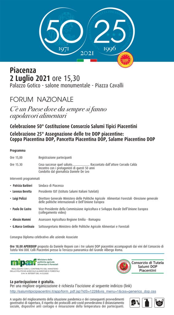 Il 2021 è un anno molto speciale per il “Consorzio Salumi Tipici Piacentini” e il “Consorzio di Tutela Salumi DOP Piacentini”. Per il primo ricorre il cinquantesimo anniversario della sua Costituzione, per il secondo ricorre il venticinquesimo Anniversario dell’assegnazione della Denominazione di Origine Protetta per la Coppa Piacentina, la Pancetta Piacentina, e il Salame Piacentino.