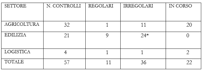 Con riferimento al dato relativo al settore dell’edilizia, si precisa che si tratta del numero di cantieri ispezionati presso i quali possono operare anche più ditte.