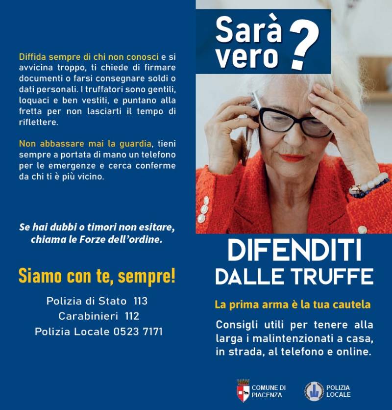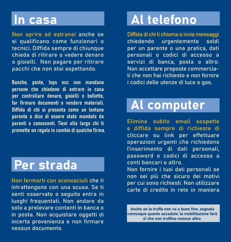 Il focus principale della campagna di sensibilizzazione è sull’accortezza nel verificare sempre le proposte ricevute, rivolgersi alle Forze dell’Ordine in caso di dubbio e usare la cautela come primo strumento per tutelare sé stessi, ricordando che il rischio di truffe – anche attraverso gli strumenti tecnologici e il web – è sempre più presente e non riguarda unicamente le persone anziane, ma anche i più giovani.