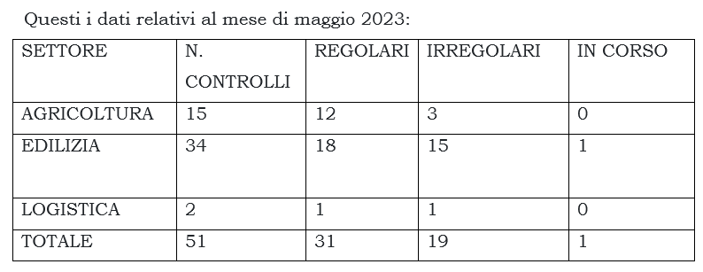Proseguono altresì controlli straordinari nei settori dell’agricoltura, della logistica e dell’edilizia, definiti nell’ambito dell’Osservatorio per la Sicurezza nei Luoghi di Lavoro, da parte degli enti ispettivi ITL, NIL, INPS, AUSL e INAIL, aggiuntivi rispetto a quelli già svolti nell’ambito delle rispettive competenze istituzionali.