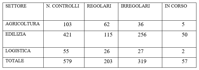 Con riferimento al dato relativo al settore dell’edilizia, si precisa che si tratta del numero di cantieri ispezionati presso i quali possono operare anche più ditte. Sono stati accertati complessivamente n. 154 lavoratori irregolari nei settori attenzionati e n. 43 lavoratori sommersi. Nell’ambito di tale attività, l’ITL ha accertato altresì l’evasione dell’importo complessivo di € 1.157.278.