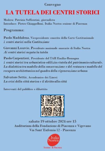 Convegno sulla tutela dei centri storici, Italia Nostra: “Fa male vedere lo smantellamento in Piazza Cittadella”. L’evento intitolato è in programma sabato 19 ottobre alle ore 15, all’Auditorium della Fondazione di Piacenza e Vigevano in via Sant’Eufemia 12. Il tema della tutela sarà affrontato da relatori di primo piano.
