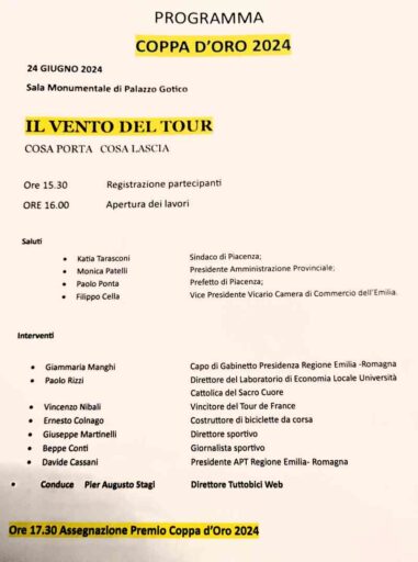 “Il primo momento sarà come al solito il convegno e avrà un titolo particolare, “Il Vento del Tour, cosa porta e cosa lascia”. I nostri amministratori, importanti giornalisti, importanti atleti, ci diranno cosa ha lasciato e cosa ha portato per loro il Tour de France. Poi avremo la premiazione della Coppa d’Oro con atleti che hanno legato il loro nome proprio al Tour. Infine una cosa abbastanza inusuale per Coppa d’Oro, ci sposteremo in piazza Cavalli e verrà organizzato un talk show dove questi grandi atleti avranno la possibilità di dialogare tra di loro con Pier Augusto Stagi, direttore di Tuttobici Web, a cui va il mio ringraziamento per la collaborazione che ci ha dato”.
