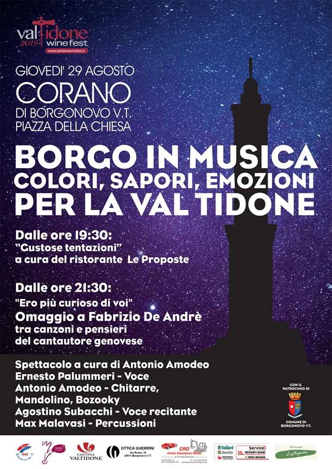 L’ormai tradizionale appuntamento che anticipa la prima data del Valtidone Wine Fest (Borgonovo 1 settembre Ortrugo&Chisöla) va in scena giovedì 29 agosto; sullo splendido palcoscenico della Piazza della Chiesa del borgo antico di Corano. A vent’anni dalla scomparsa del celebre cantautore genovese, la serata in Val Tidone sarà prima di tutto un omaggio a Fabrizio De Andrè; grazie allo spettacolo “Ero più curioso di voi”, curato da Antonio Amodeo; tra pensieri e canzoni che hanno fatto la storia della musica italiana, da Bocca di Rosa a Marinella.