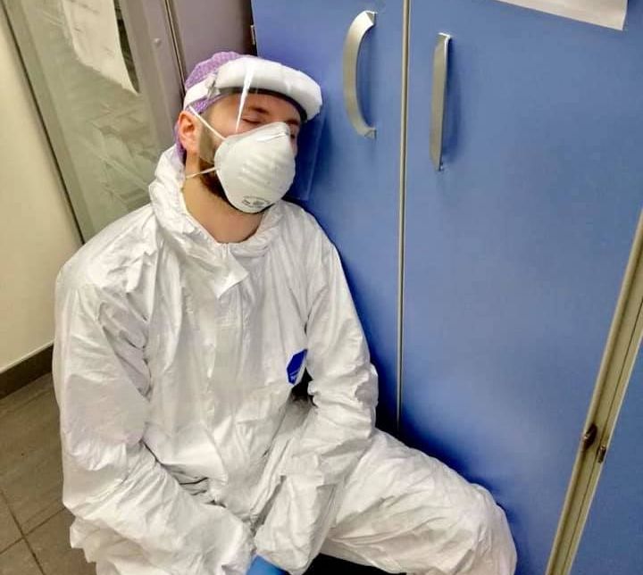 “Guardate questa foto: ritrae uno dei nostri medici stremato al termine dell’ennesimo turno di lavoro. Ci aiuta a capire quanto impegno e sacrificio stiano dedicando i medici, gli infermieri e gli operatori, schierati in prima linea per difendere la nostra comunità da questo virus”.