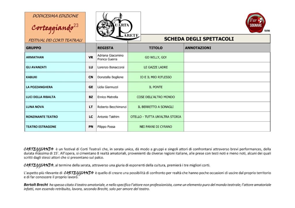 Corteggiando dodicesima edizione, torna dopo una pausa di tre anni sabato 14 ottobre dalle ore 20.45 al Teatro San Matteo di Piacenza. La manifestazione è organizzata dal Gruppo Teatrale Quarta Parete con il patrocinio del Comune di Piacenza.