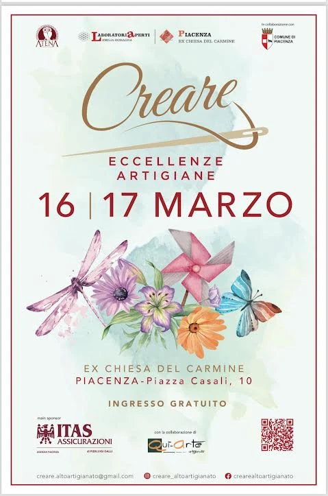 CREARE – Mostra-mercato di alto artigianato 16-17 marzo 2024 – Orari: dalle 10.00 alle 19.00 – Ex Chiesa del Carmine – Laboratorio Aperto di Piacenza – Piazza Casali, 10.