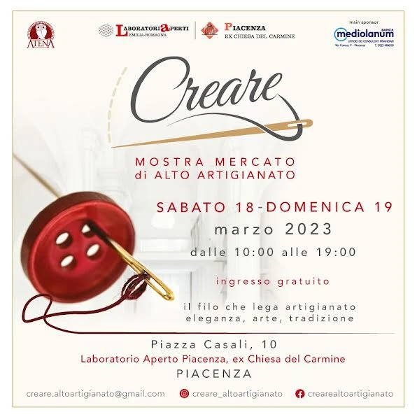 Lampade e lampadari, oggetti in porcellana, stoviglie, gioielli, borse, abiti, scarpe, costumi, ombrelli e complementi d’arredo, tutti accomunati da un unico denominatore comune: l’hand made. Oggetti unici e irripetibili che, sabato 18 e domenica 19 marzo, daranno vita alla prima edizione di Creare, originale mostra-mercato di alto artigianato organizzata da Atena e in programma all’ex Chiesa del Carmine – Laboratorio Aperto di Piacenza nella centralissima Piazza Casali, a due passi da Palazzo Gotico e proprio di fronte ai Musei di Palazzo Farnese.