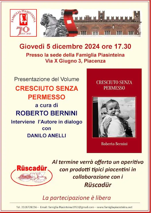 Giovedì 5 dicembre alle ore 17.30 presso la sede della Famiglia Piasinteina si terrà la presentazione del volume “CRESCIUTO SENZA PERMESSO”, di Roberto Bernini. Interviene l’Autore in dialogo con Danilo Anelli.