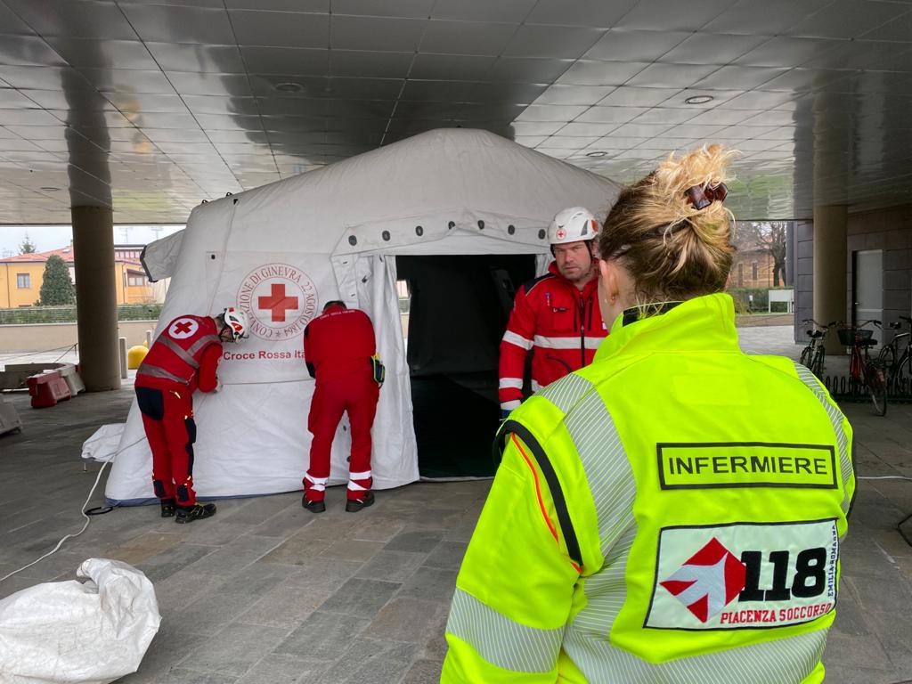 Il personale addestrato al montaggio delle strutture campali pneumatiche ha provveduto all’allestimento di tende polivalenti nell’area esterna del pronto soccorso di Castel San Giovanni e del pronto soccorso di Fiorenzuola D’Arda, con funzione di pre-triage e filtraggio degli accessi ospedalieri, e un’altra tenda nel cortile della Casa Circondariale delle Novate per esigenze del personale carcerario ed infermieristico.