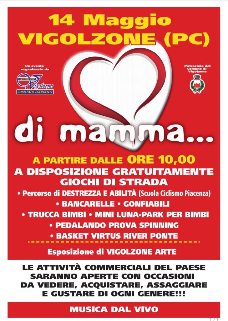 L’evento “Cuore di Mamma” di domenica il 14 maggio a Vigolzone è organizzato dal Comitato Esercenti di Vigolzone con il patrocinio del Comune di Vigolzone.